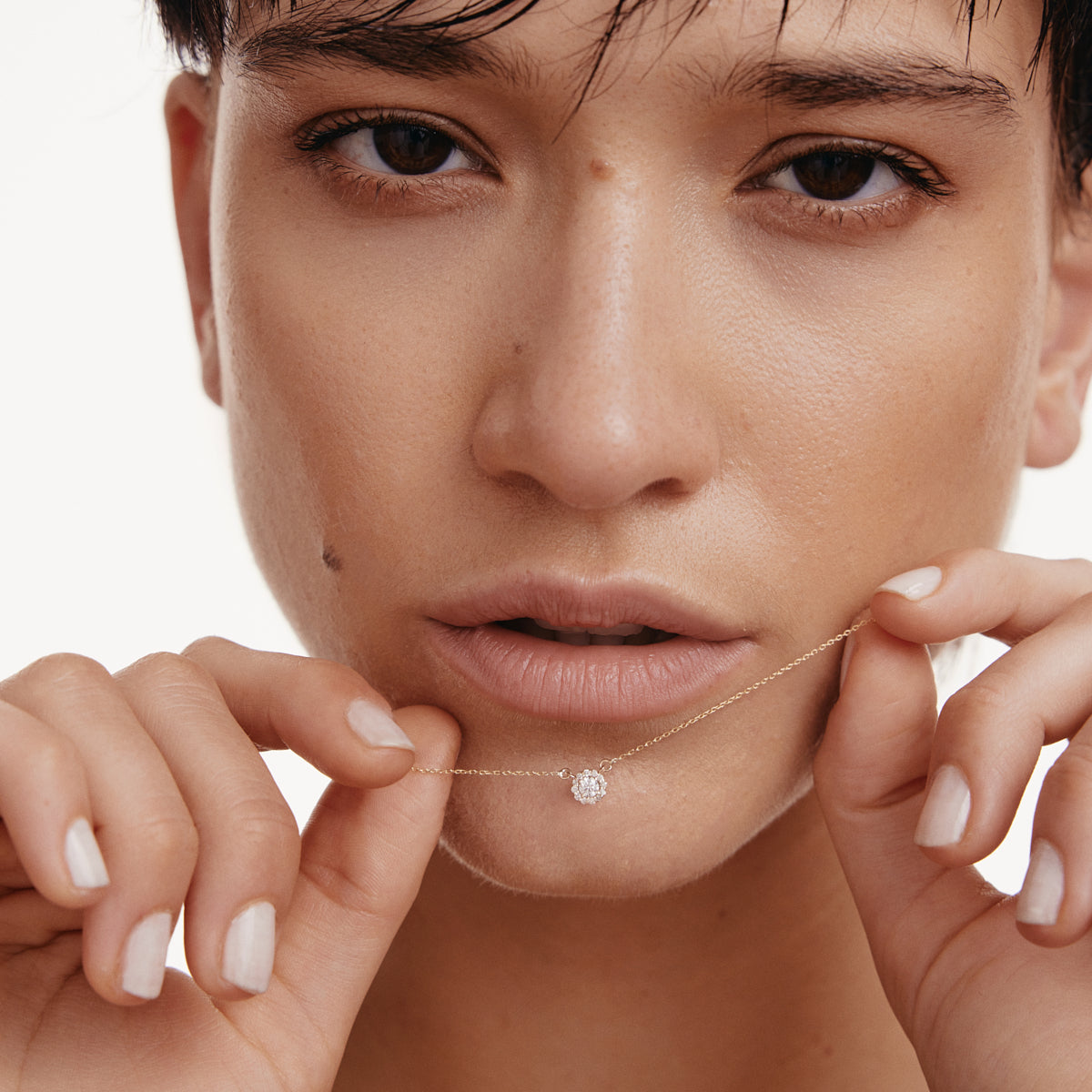 Adorn yourself with the sparkling diamond halo necklace in 14k gold. This elegant piece of genuine gold jewelry is a perfect gift for her that offers a subtle yet radiant sparkle. The focal point of this design is a diamond halo pendant that offers an exquisite charm that is sure to complement any ensemble. This dainty necklace is not just an accessory - it is a statement of elegance.