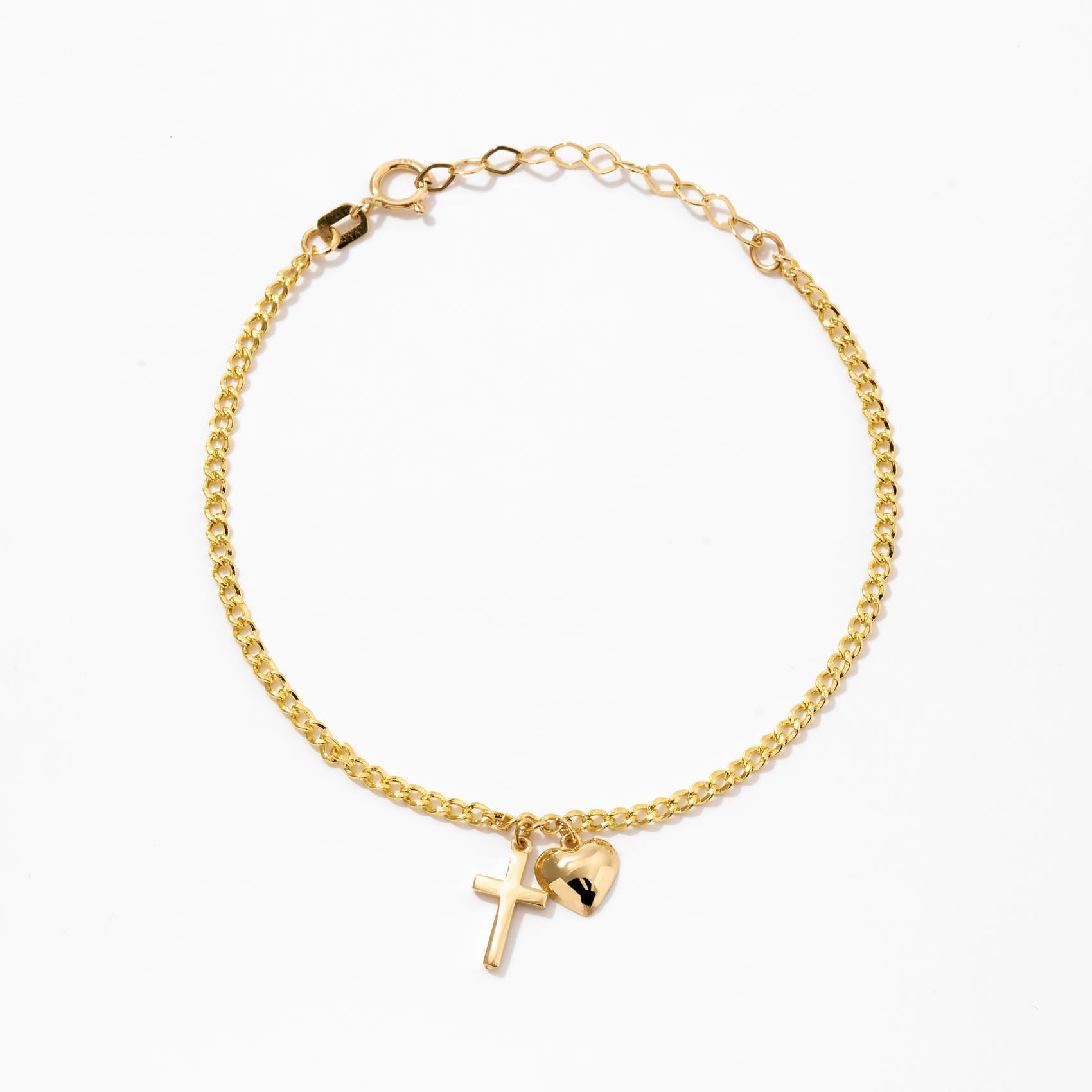 Außergewöhnliches Armband mit Kreuz- und Herzanhänger aus 585er Massivgold ist ein Meisterwerk der Handwerkskunst und Stil. Dieses atemberaubende Accessoire, perfekt für den täglichen Gebrauch oder besondere Anlässe, kombiniert die Symbole der Liebe und des Glaubens in einem filigranen, zeitlosen Design. Mit seiner hochwertigen Konstruktion aus 585er Massivgold bietet dieses Armband Langlebigkeit und ein luxuriöses Gefühl. Die Kreuz- und Herzanhänger verleihen eine Note von Eleganz und Sentimentalität und machen es zu einem idealen Geschenk für geliebte Personen. Dieses Charme-Armband ist nicht nur ein modisches Statement, sondern auch ein Ausdruck von Hingabe und Zuneigung, der sicherlich Aufmerksamkeit und Komplimente auf sich ziehen wird.